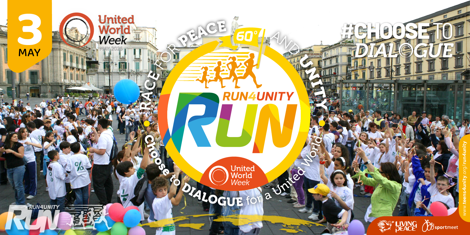 Run4Unity is an event that in previous years has involved over 100,000 teenagers in various cities of every corner of the globe.